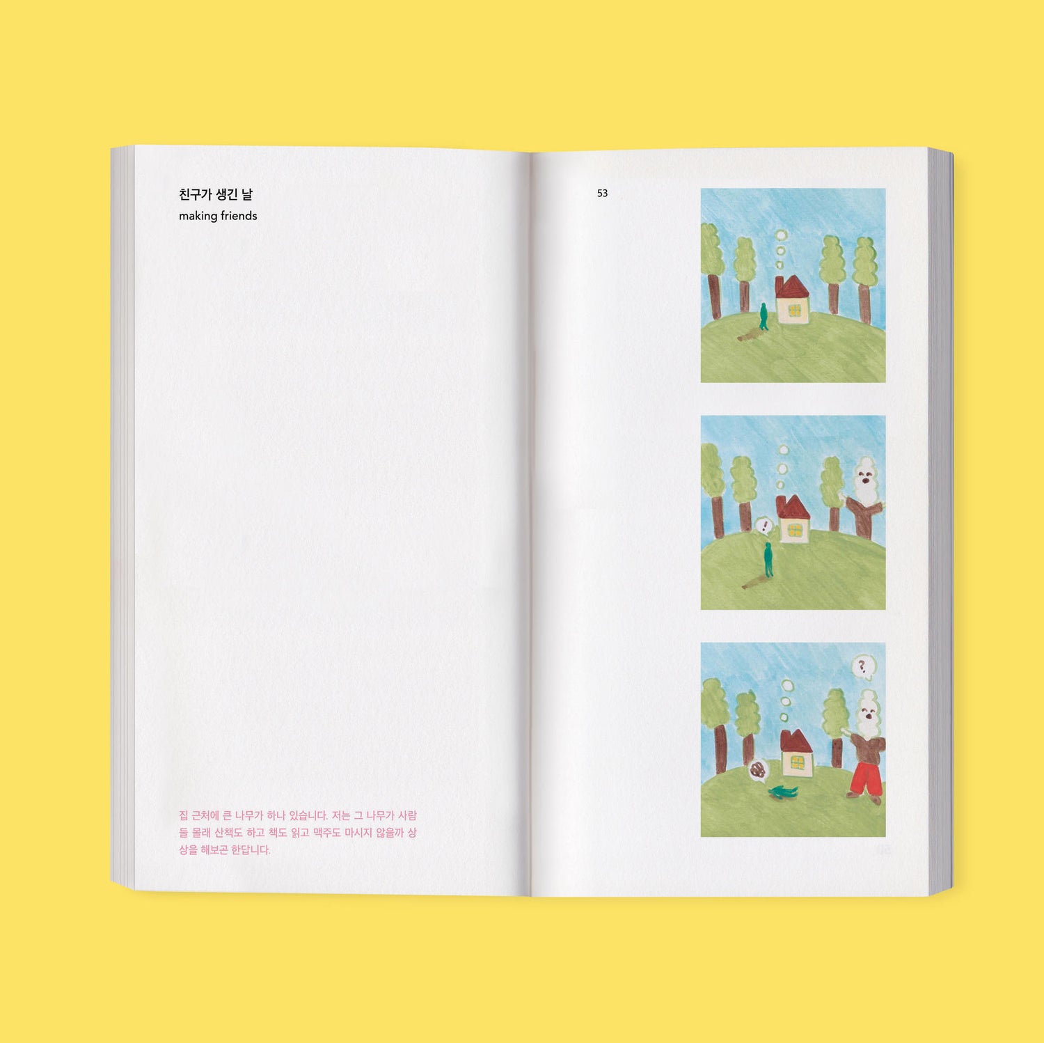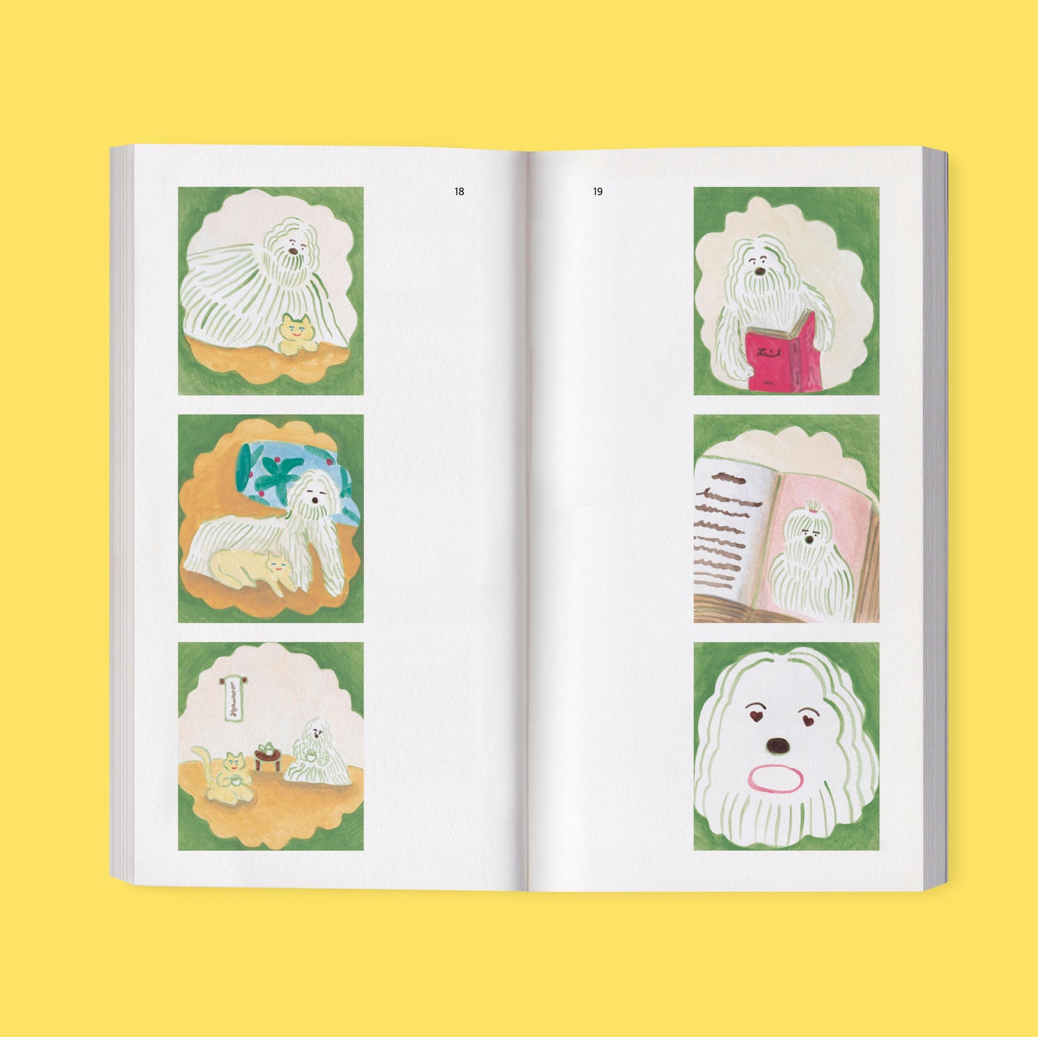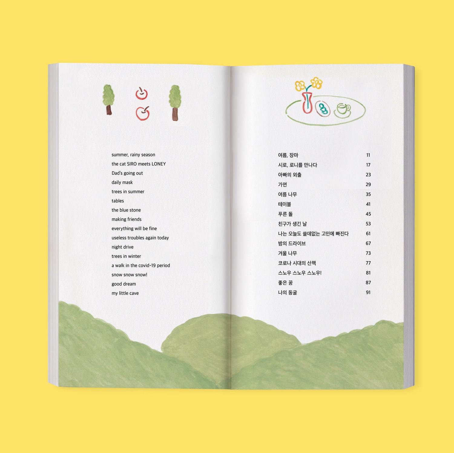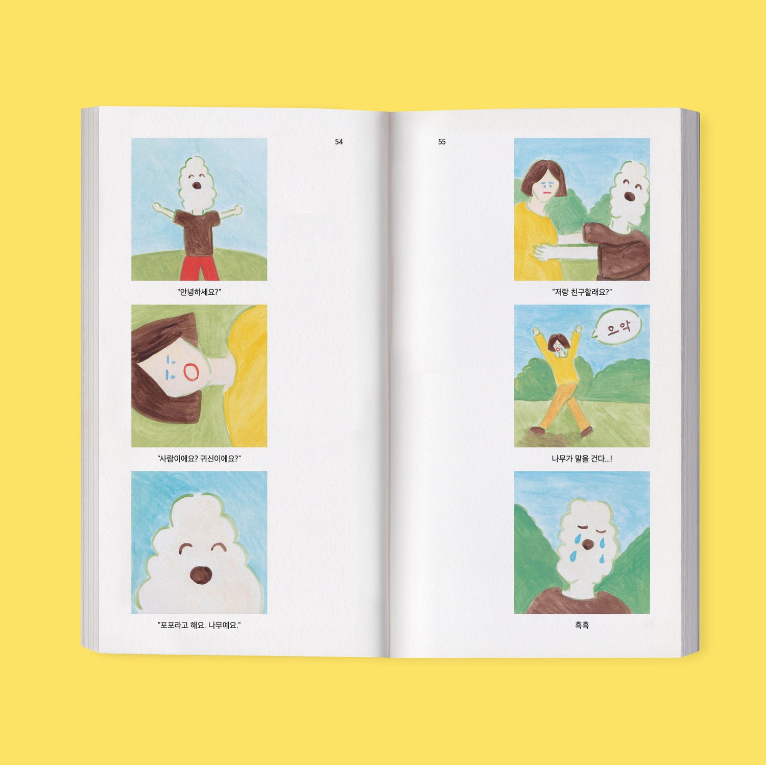 This book feel is mostly in the form of silent comics. The main characters are Eunji, Incheol and their cats Kuro and Shiro. Also, the dog Ronnie and the tree Popo - who live in Eunji’s imaginary space called ‘little room’ - appear occasionally.