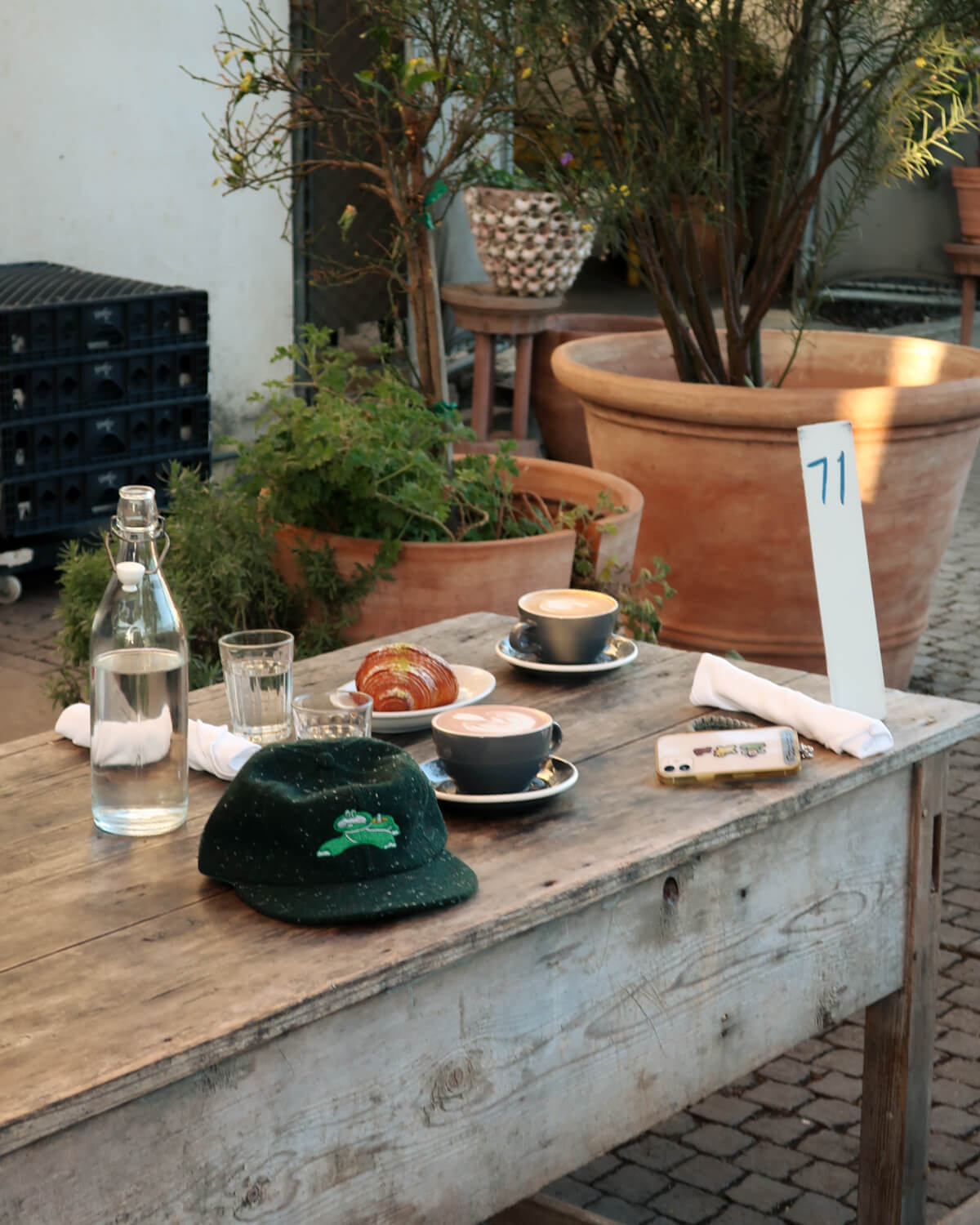 Speckled wool hat with the Dinosaur Onsen embroidery, designed by Saigo no Shudan.