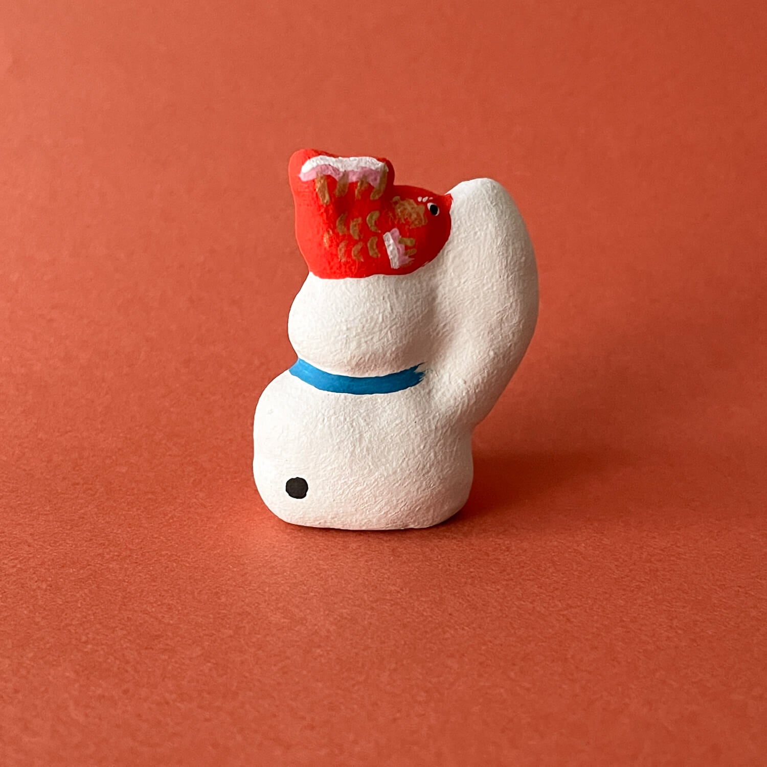 A handmade clay doll of beckoning cat by habotan , a Japanese artist based in Tokyo.