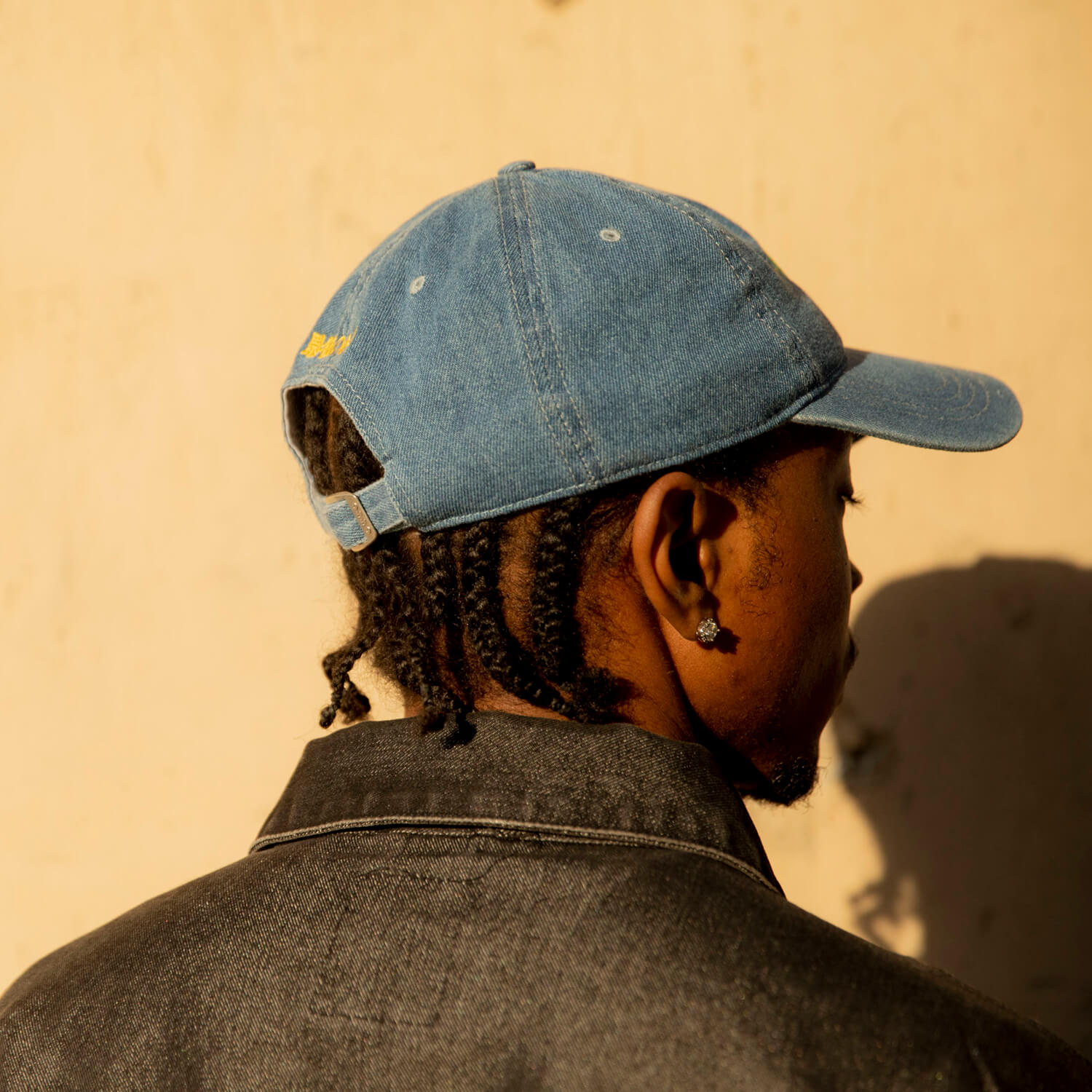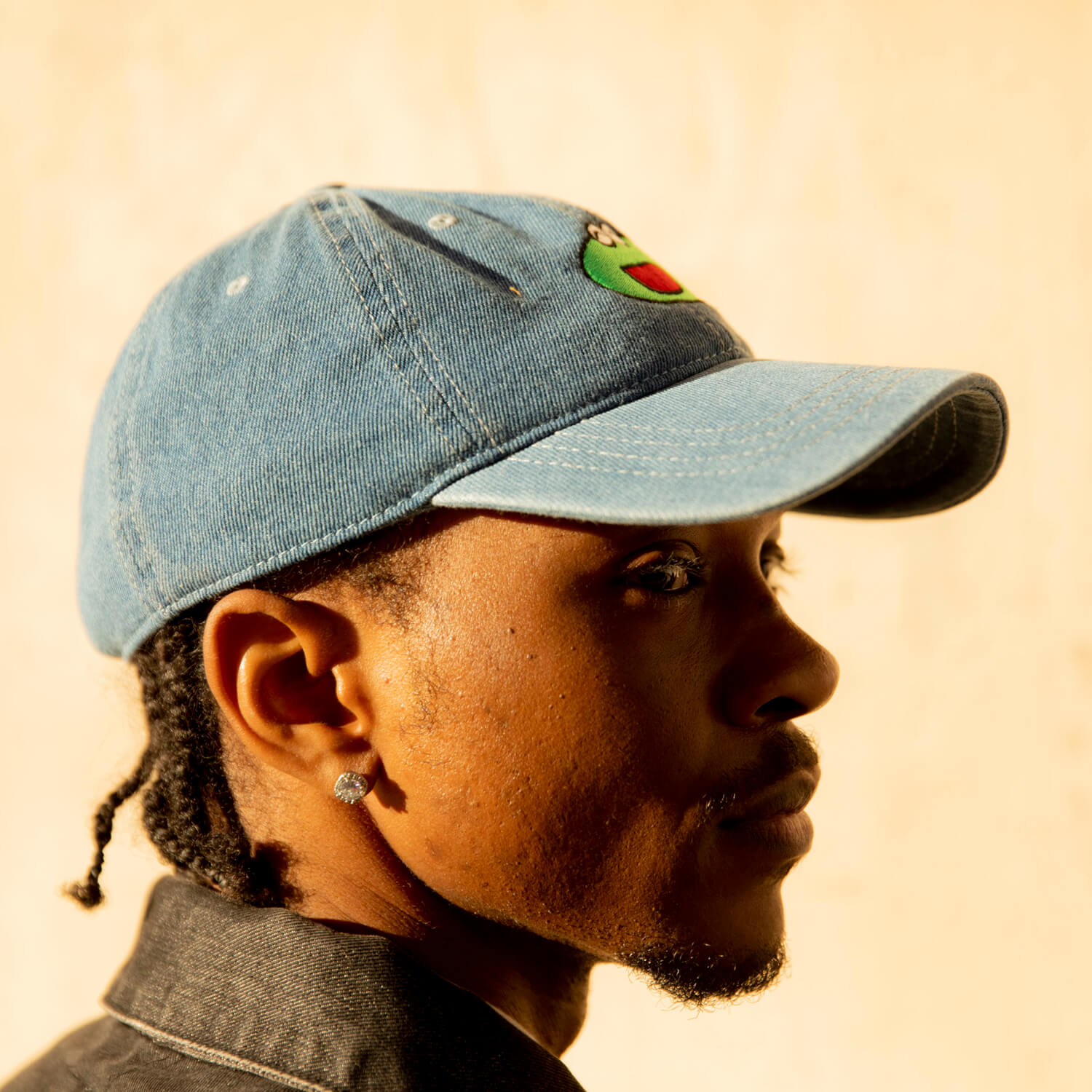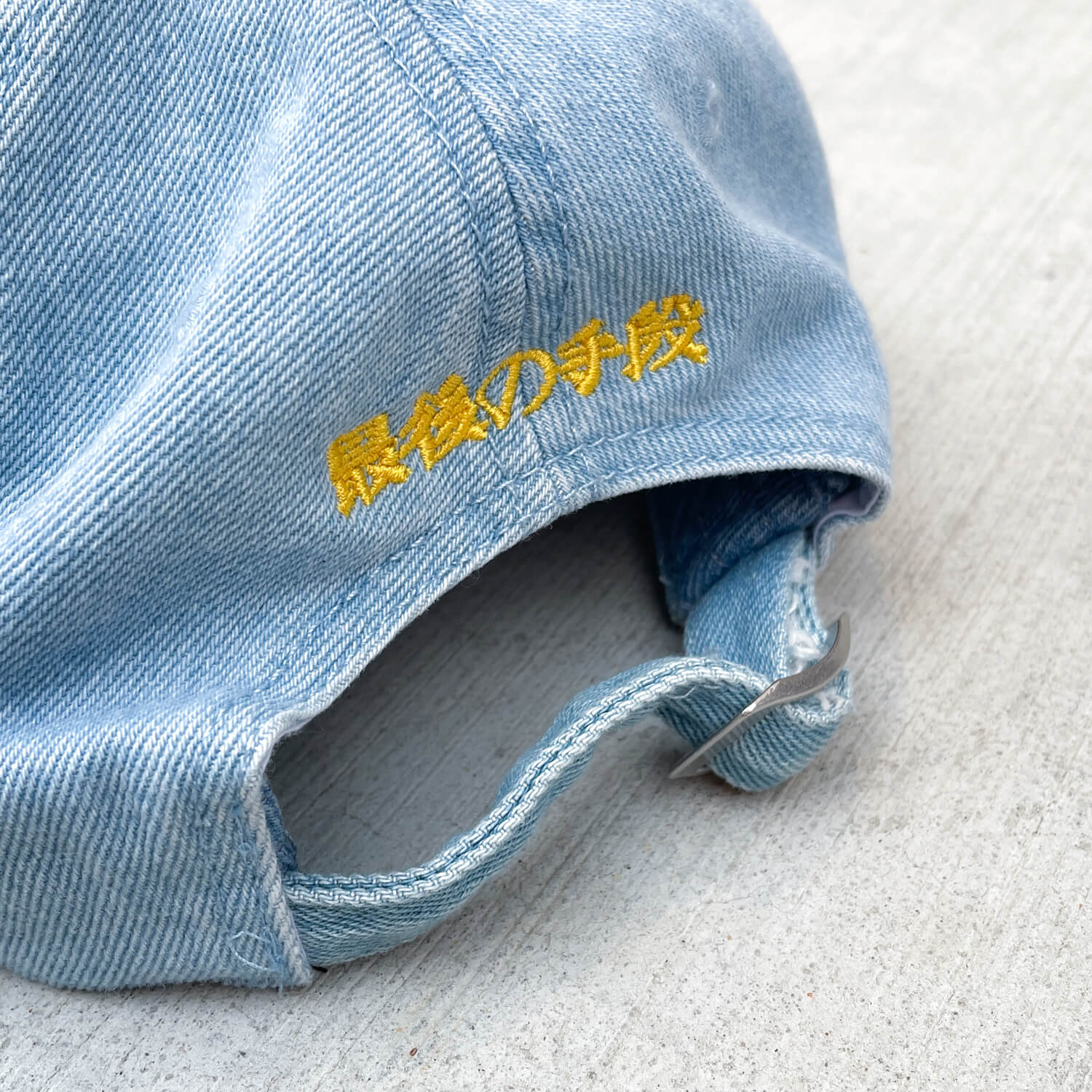 Denim hat with signature Frog embroidery, designed by Saigo no Shudan.