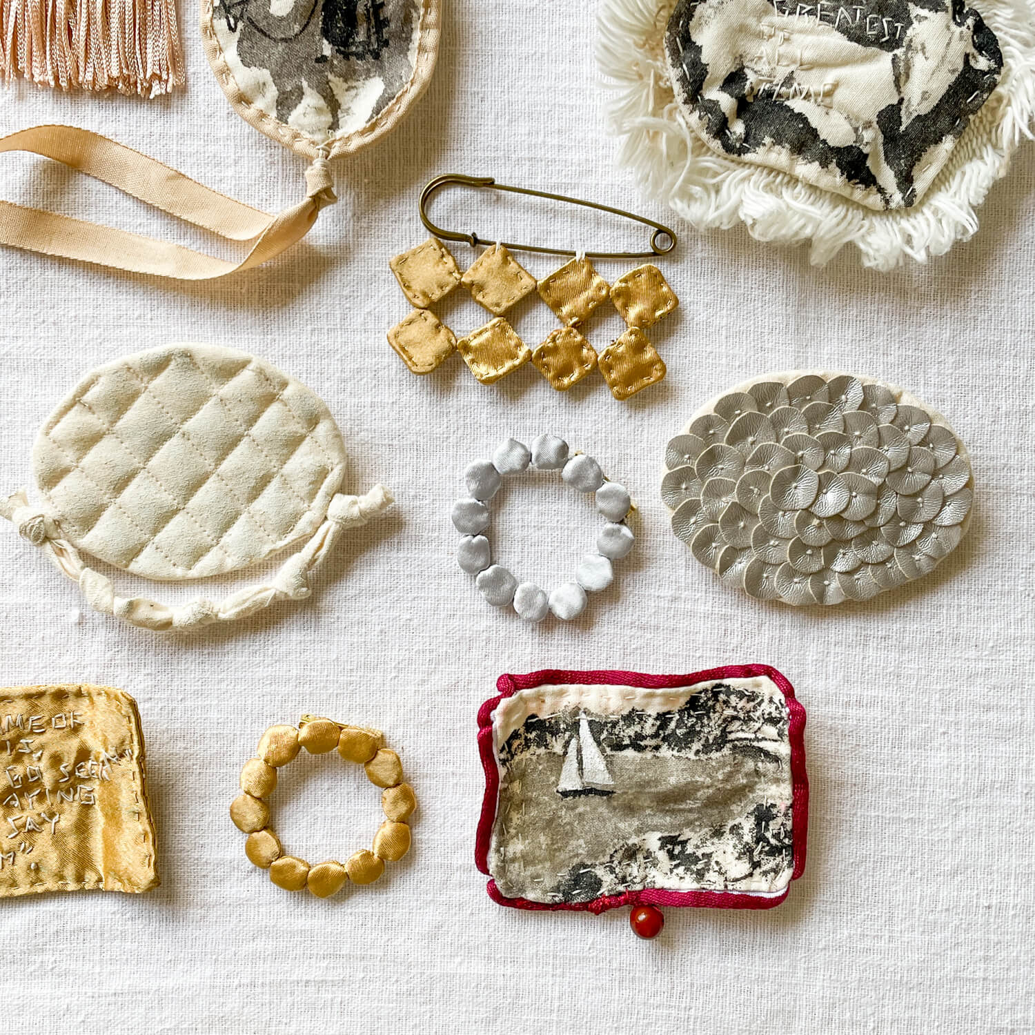 Materials: Made with cotton, polyester, beads, acrylic gouache, and brass, etc.