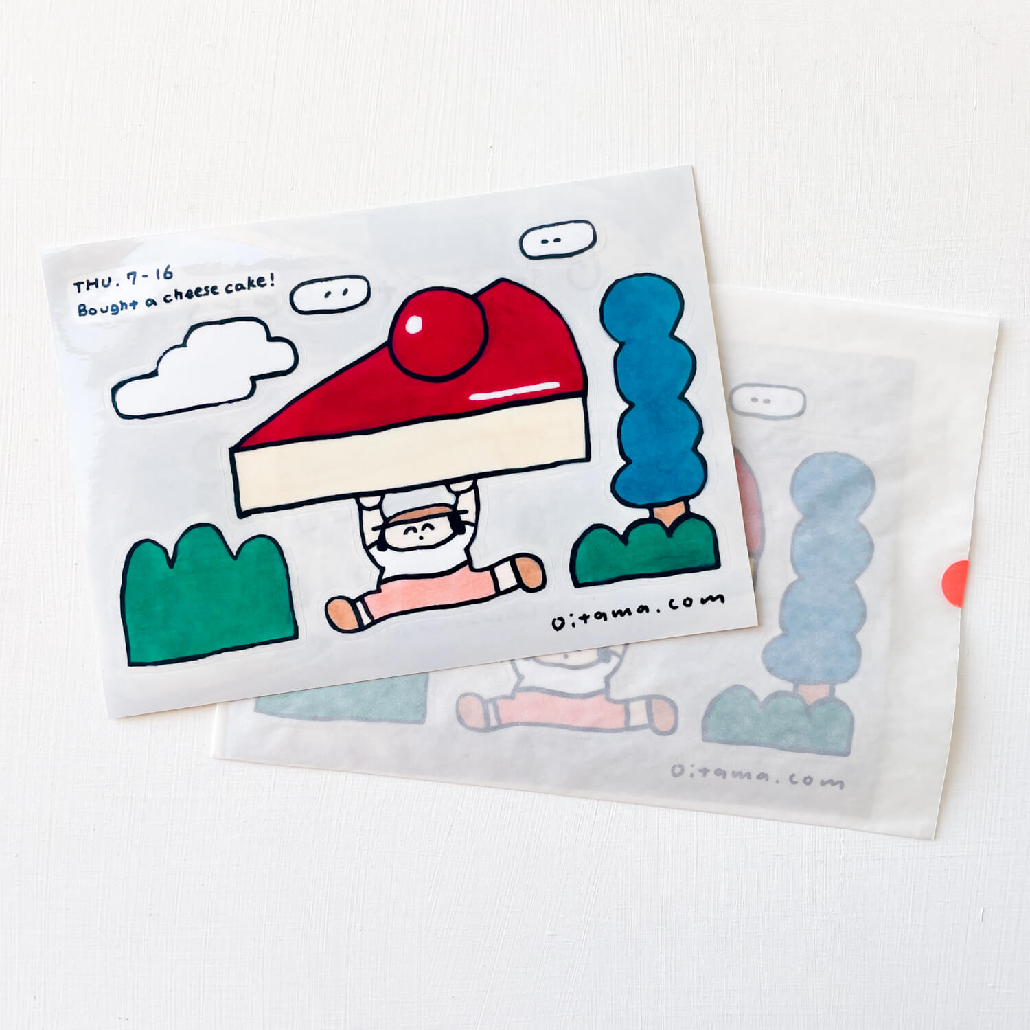 A set of 6 stickers on a sheet illustrated and designed by oitama.