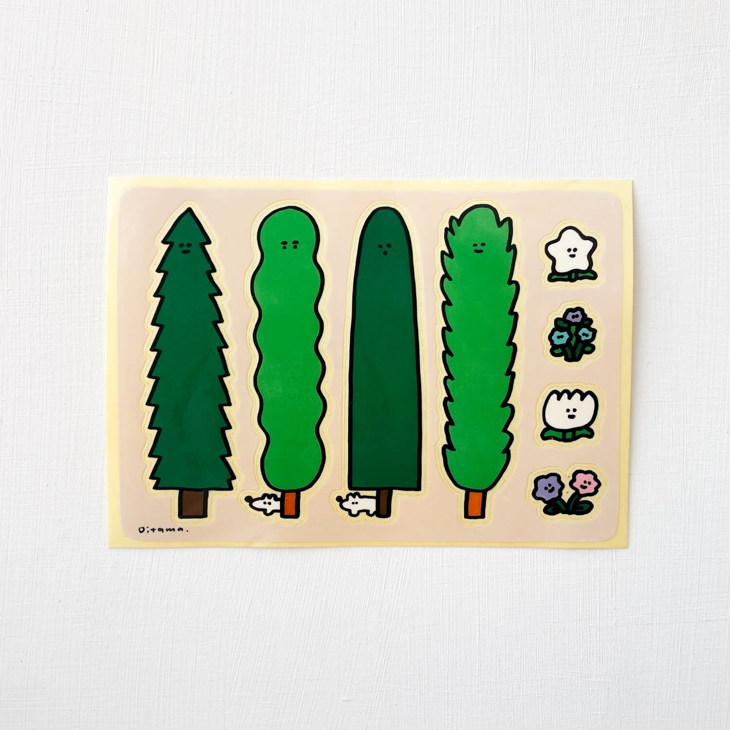 A set of stickers of four trees and four flowers on a sheet, illustrated by oitama.