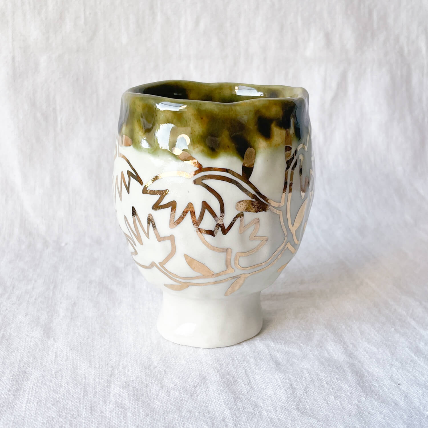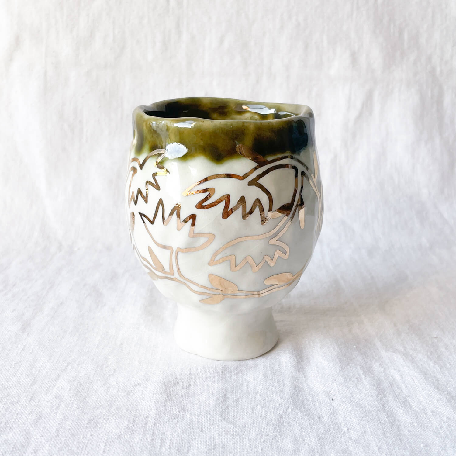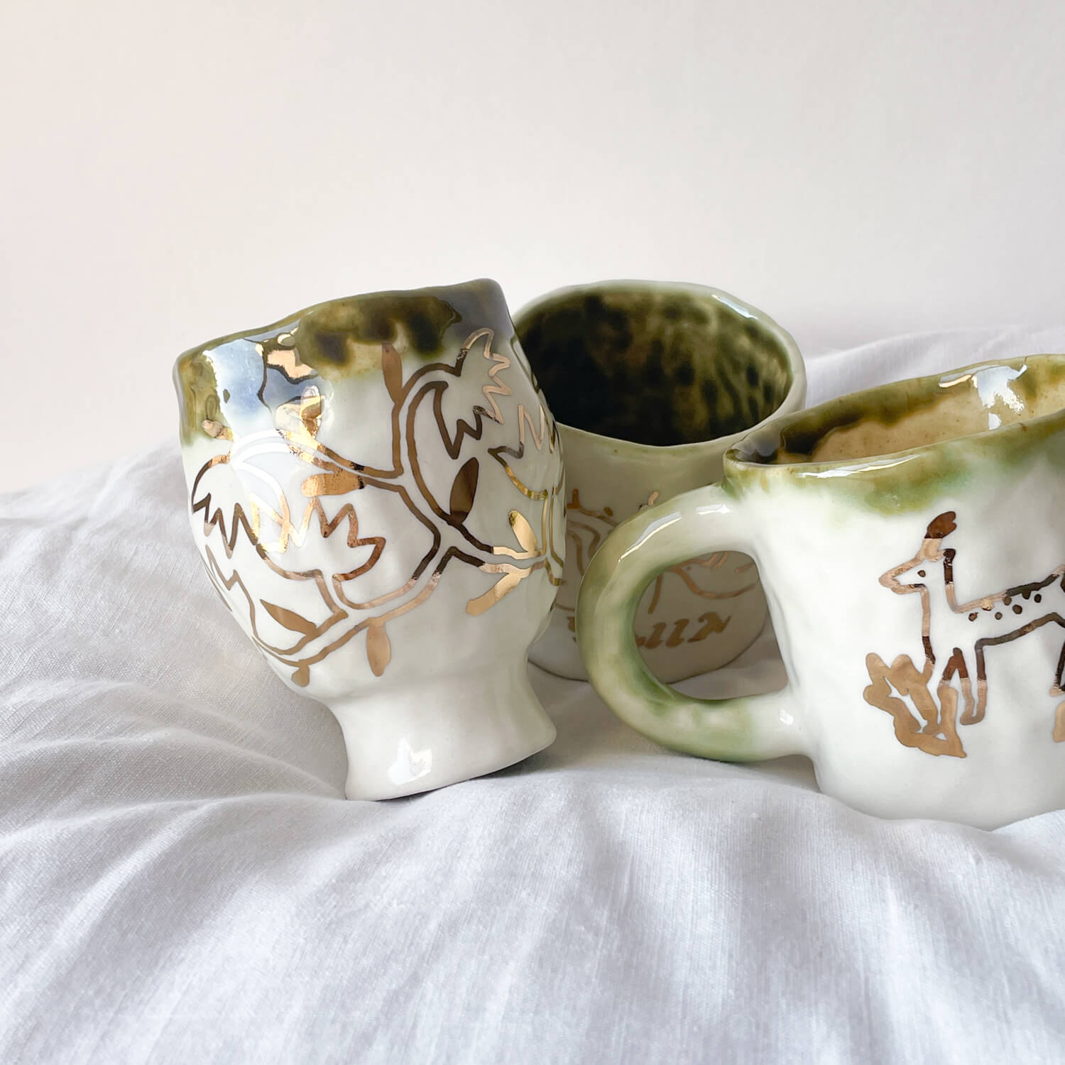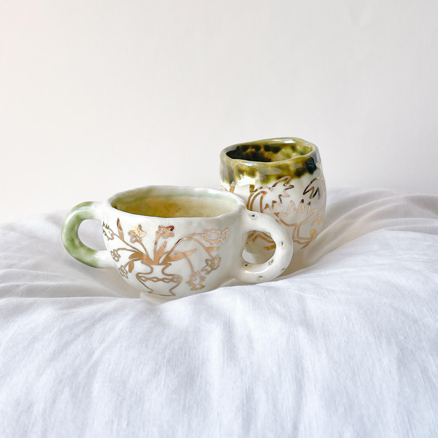 It is hand-built and drawn with gold glaze illustrations. All items are one-of-a-kind.