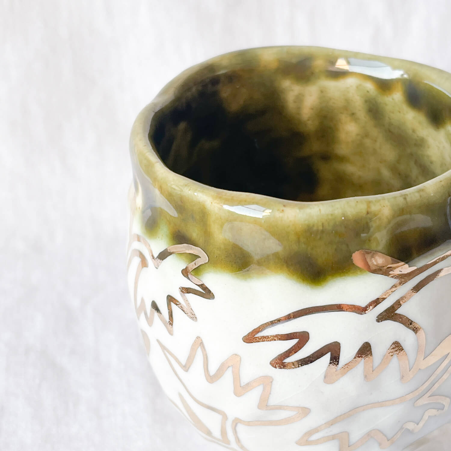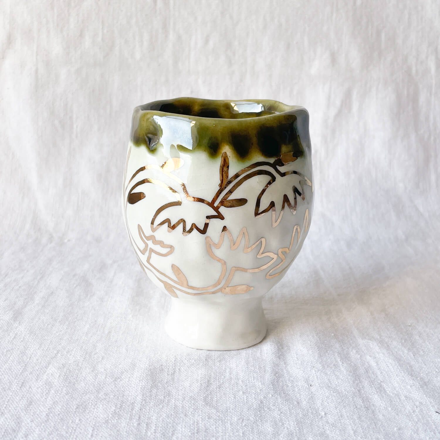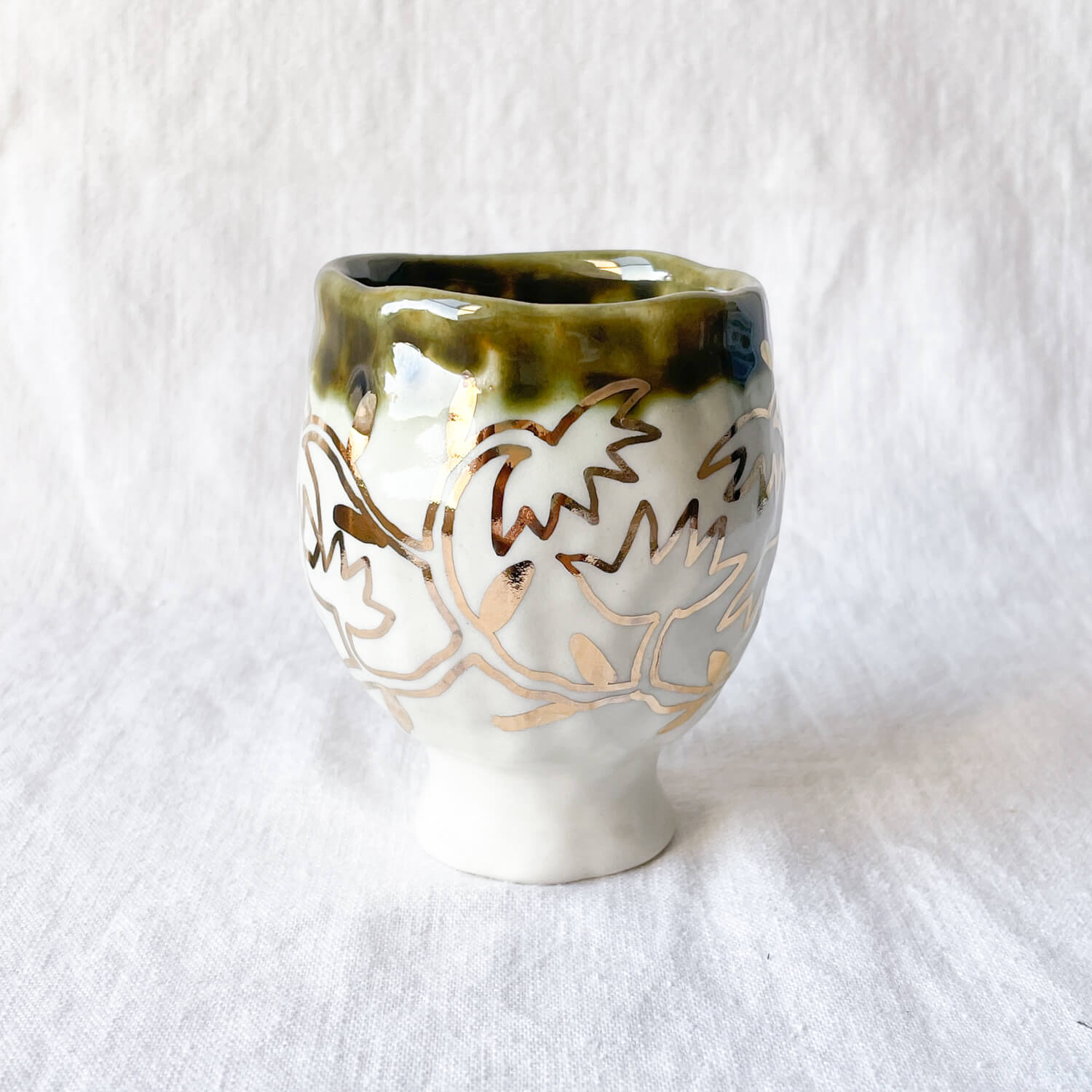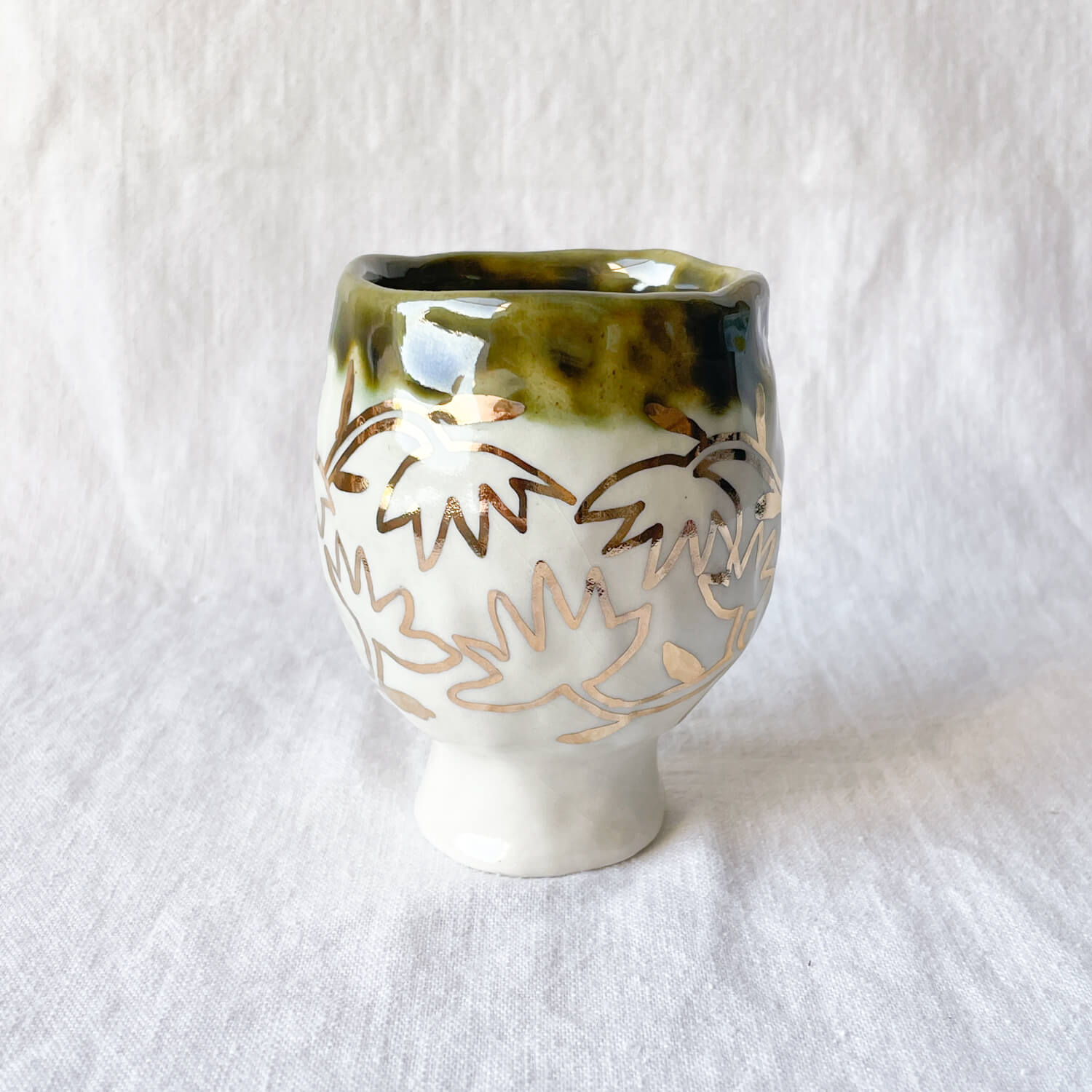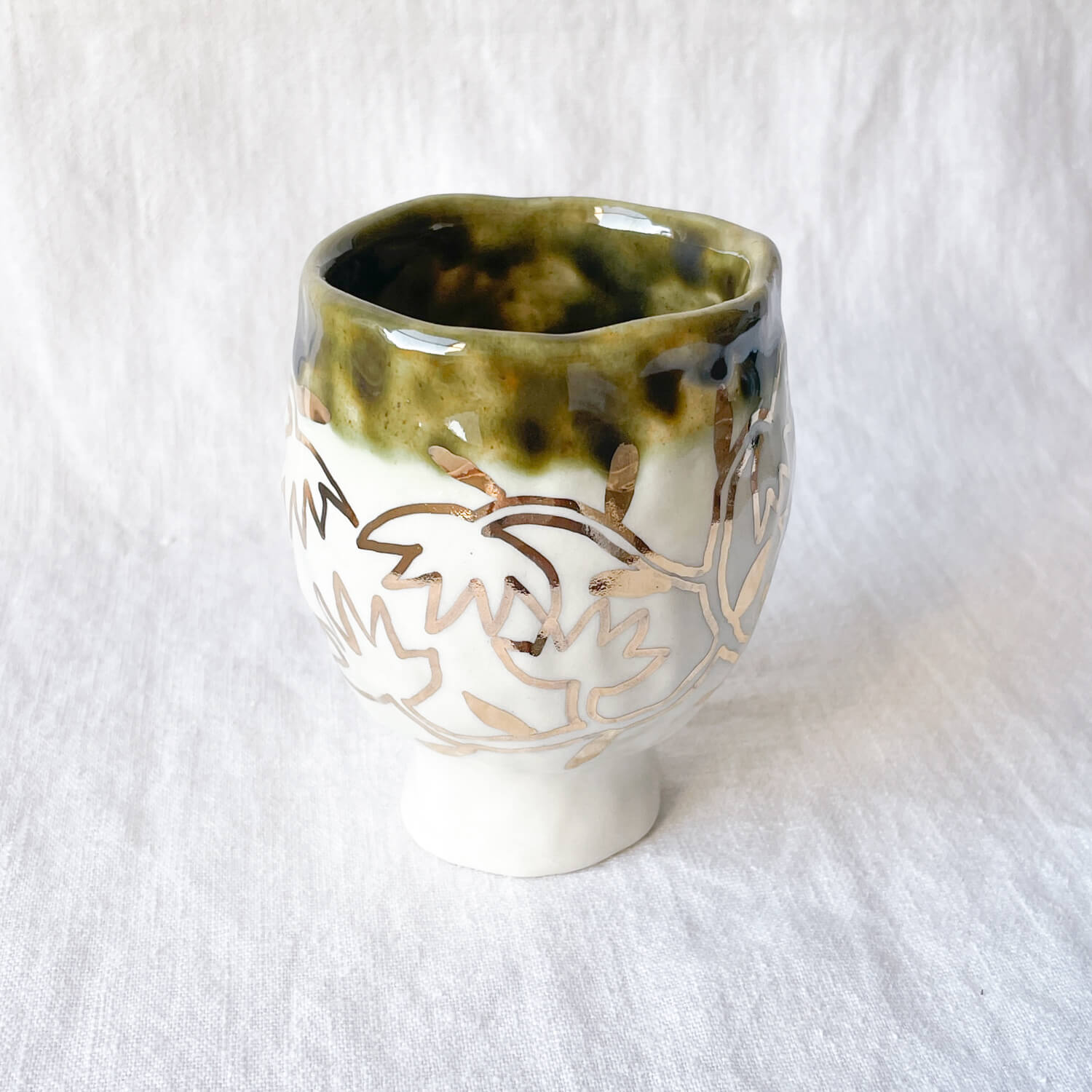 It is hand-built and drawn with gold glaze illustrations. All items are one-of-a-kind.