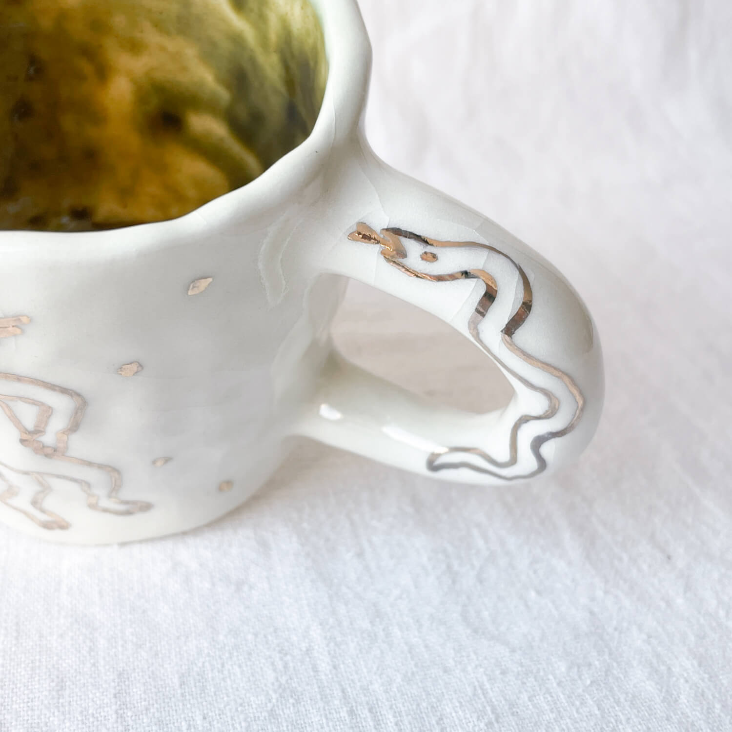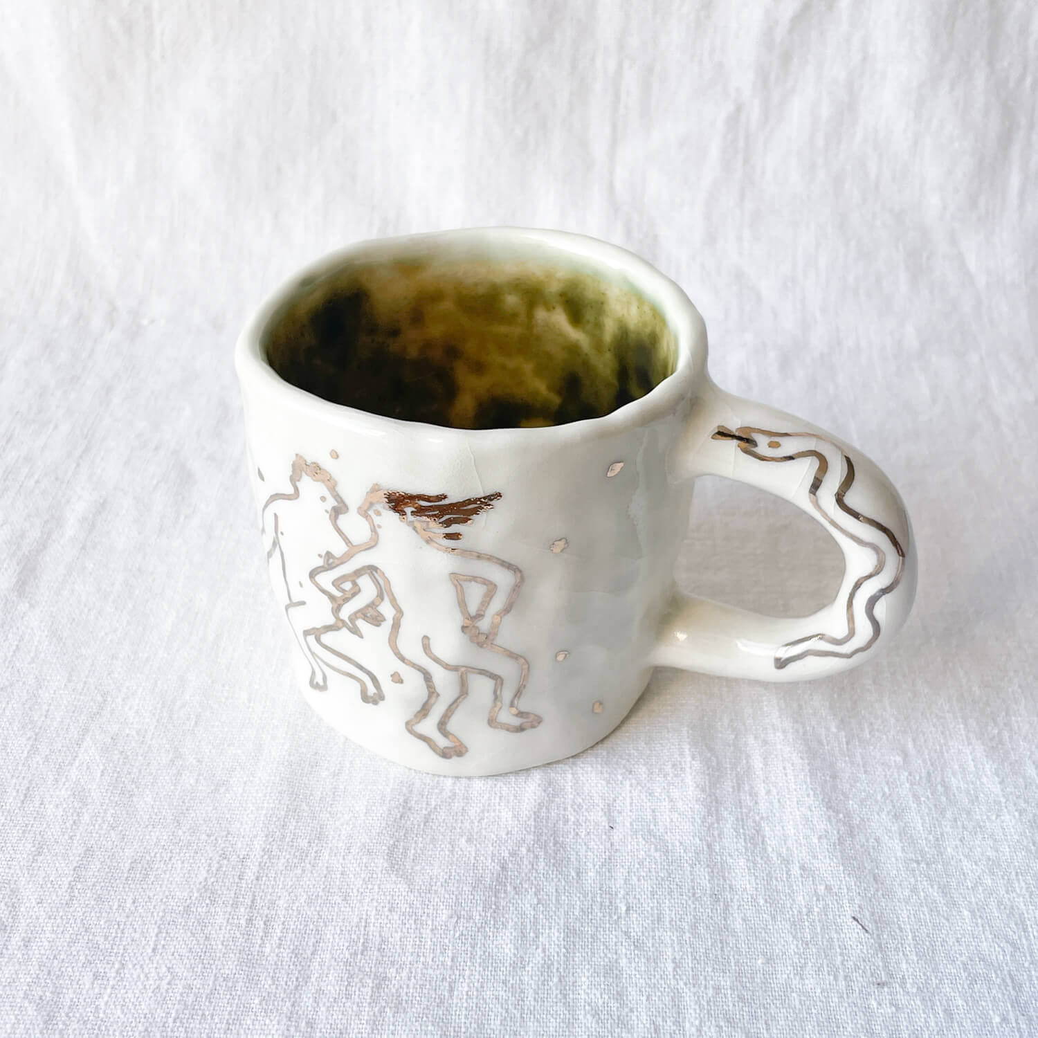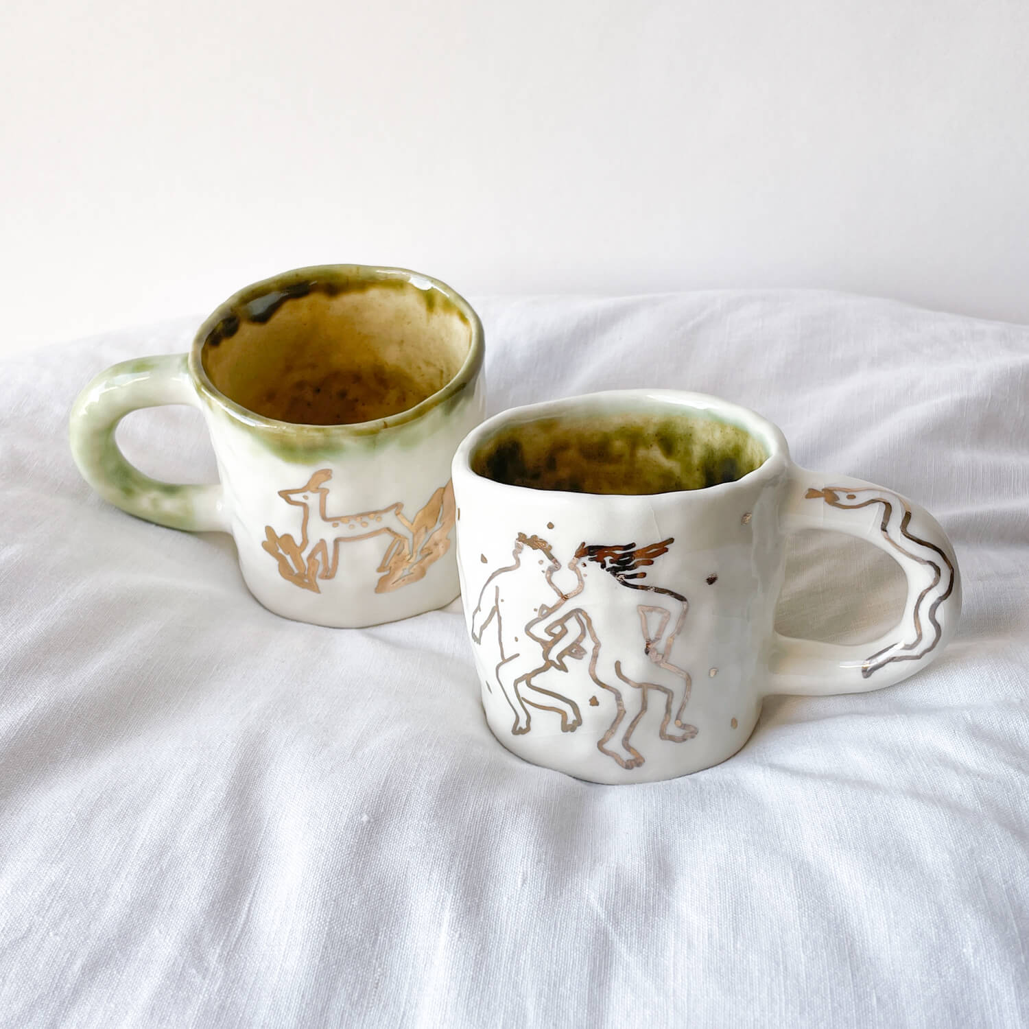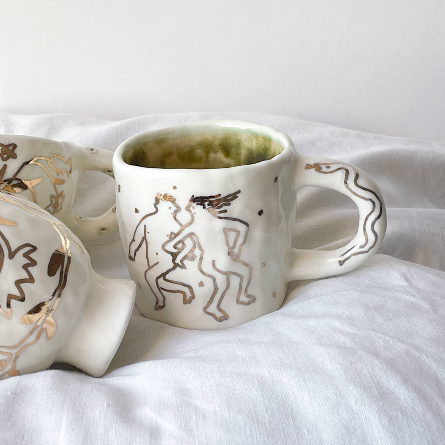 It is hand-built and drawn with gold glaze illustrations. All items are one-of-a-kind.