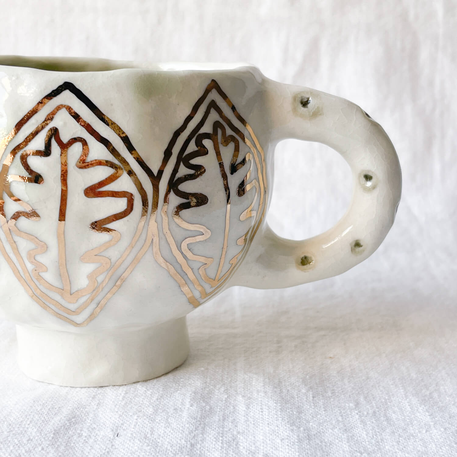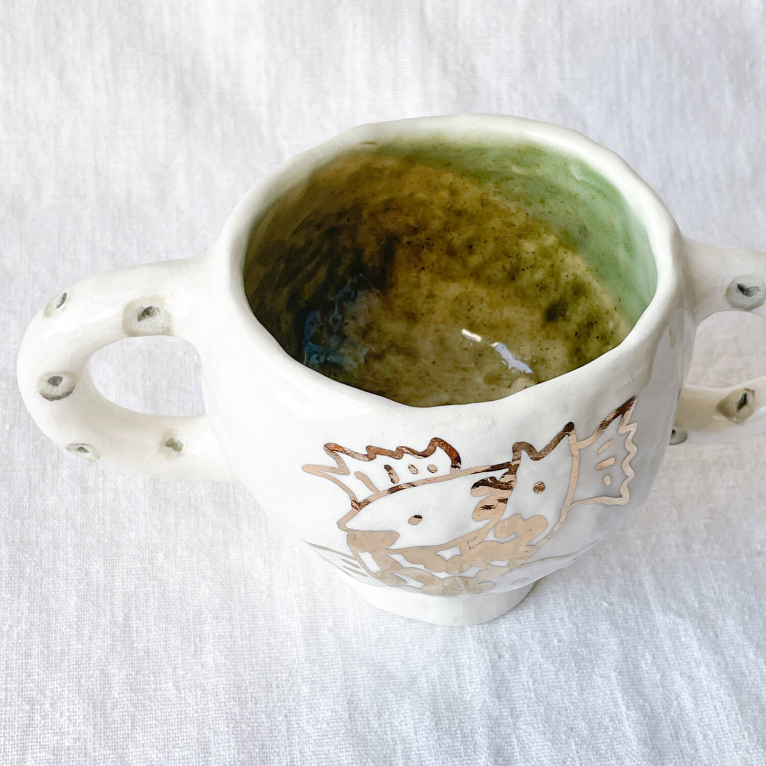 It is hand-built and drawn with gold glaze illustrations. All items are one-of-a-kind.
